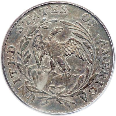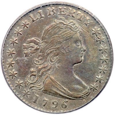The 1796 half dime has eight stars on the left and seven on the right, representing the fifteen states, including the new states of Vermont (#14) and Kentucky (#15). In 1796, there is this late die-state example with a broken "B" in Liberty that appears as "LIKERTY" and an overdate. Pop 2; 12 finer (PCGS # 94254).