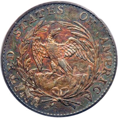 This gorgeous toned beauty is immensely sharp in the centers. All hair curls show magnificently, as does the drapery at the shoulder and lower bust. Meanwhile, the eagle's crisp detail compares favorably with some of the finest struck examples of this issue. The mint luster spreads softly and to its full extent beneath the toning, which itself gathers together into the deepest hues around the margin, leaving the centers to play with the colorful kaleidoscopic effects. No adjustment marks are seen. The only marks of any note on either side are a couple of light abrasions in the lower reverse field near the second S in STATES, which may be useful to the future provenance tracer and also a faint hairline scratch across the neck at the merger of the throat and upper chest. The lovely patina grabs your attention at once and never lets go. Pop 3; 4 finer; 2 in 63; 1 in 64; 1 in 67. (PCGS # 94254).