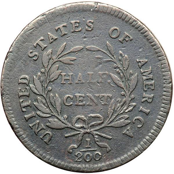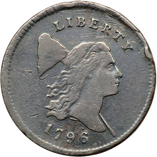 1796 C-2 R4 With Pole F15. Sharpness VF20 or slightly better but there are small rim nicks on both sides, strongest at the top of the obverse. In addition the portrait displays very light scratches and scuff marks, mostly in the hair, with a few more above the head. The marks blend into the attractive glossy olive brown and chocolate toning and the eye appeal of this piece remains excellent for the grade. The planchet is smooth, void of any trace of corrosion or verdigris. MDS with the reverse rotated 15 degrees CCW. The date and legends are complete and strong. Not perfect but still a very nice example of this very tough date, the undisputed key date in the half cent series. Noyes photo #73607. Weight 88.7 grains.