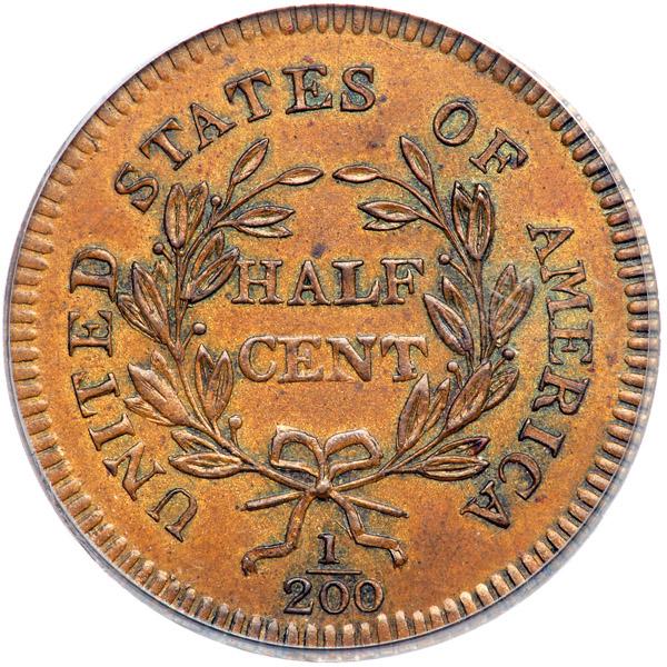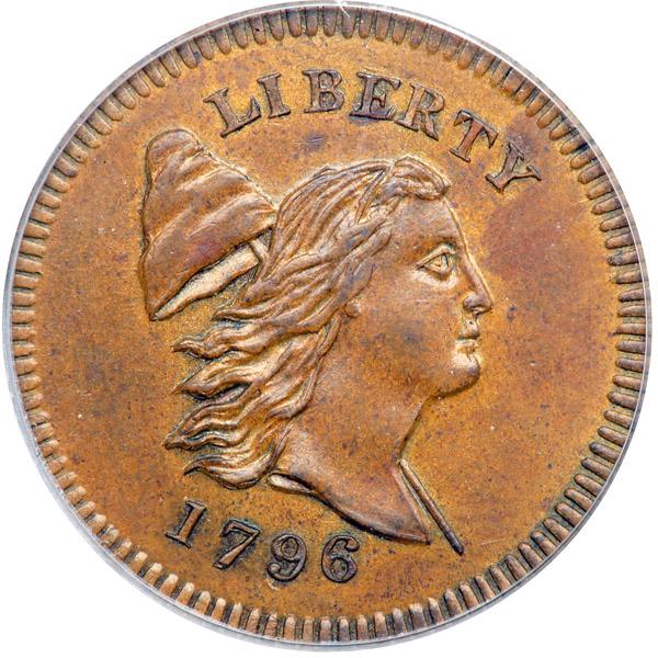 1796 Edwards Copy Kenny-1 R7. PCGS graded MS-63 Brown. Choice glossy light brown. The only defects are a small carbon spot over the A in HALF and another under the B in LIBERTY. A very attractive example of this popular rarity. The repunching on the 79 in the date is clear. NOTE: The Edwards copies of the 1796 half cent were struck using hand-made dies on rolled copper planchets that are a bit thinner and lighter than the genuine version. The workmanship is of good quality and the resulting design is a fairly accurate representation of the genuine article. These were struck sometime prior to 1865, and the first auction appearance came in 1866. Reportedly only 12 pieces were struck before the dies were destroyed. These copies are highly sought and seldom appear for sale, so the reported "mintage" appears accurate. Our grade is MS60+. PCGS population 1 with 3 finer. The attribution and Davy provenance are noted on the PCGS label. Weight 74.2 grains. Davy #96.3.5.
