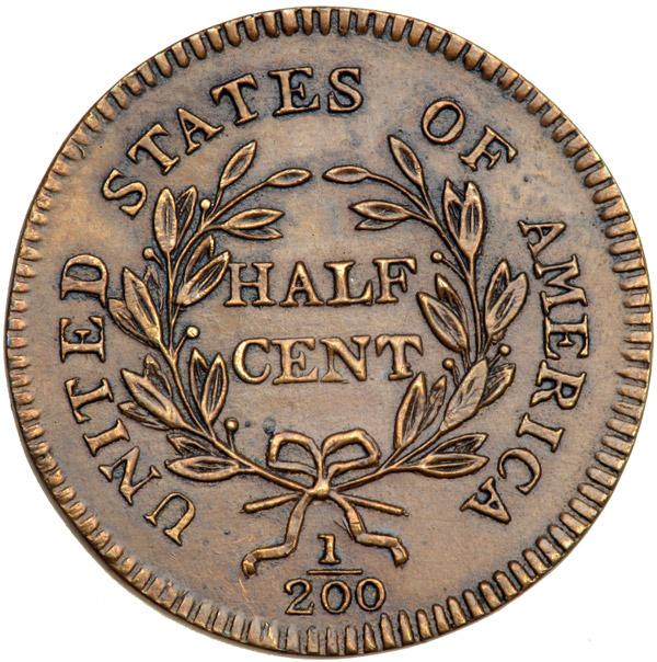 1796 Edwards Copy Kenny-1 Rarity-7 EF45. Choice glossy medium brown. The surfaces are smooth and the eye appeal is excellent. A strong glass reveals that there are some extremely faint hairlines in the field before the portrait, all well hidden under the glossy toning. The only notable mark is a faint, very light but fresh scuff down from the left ribbon end. The edge under the date is covered with very fine but uniform reeding, which is quite unusual. The Edwards copies of the 1796 half cent were struck using hand-made dies on rolled copper planchets. These planchets vary greatly in weight, with the currently known specimens ranging from 59.4 grains to 94.5 grains and scattered rather randomly at various weights between these extremes. This piece is near the middle of the range. The workmanship is of good quality and the resulting design is a fairly accurate representation of the genuine article. These were struck sometime prior to 1865, and the first auction appearance came in 1866. After the death of Dr. Edwards, Edward Cogan wrote that he had destroyed the dies and all but 12 of the remaining specimens. It is possible, of course, that Dr. Edwards had distributed a few additional specimens before his death. These copies are highly sought and seldom appear for sale, and the population of known specimens appears to match the reported survivorship, or nearly so. Weight 72.4 grains. Davy #96.3.4.