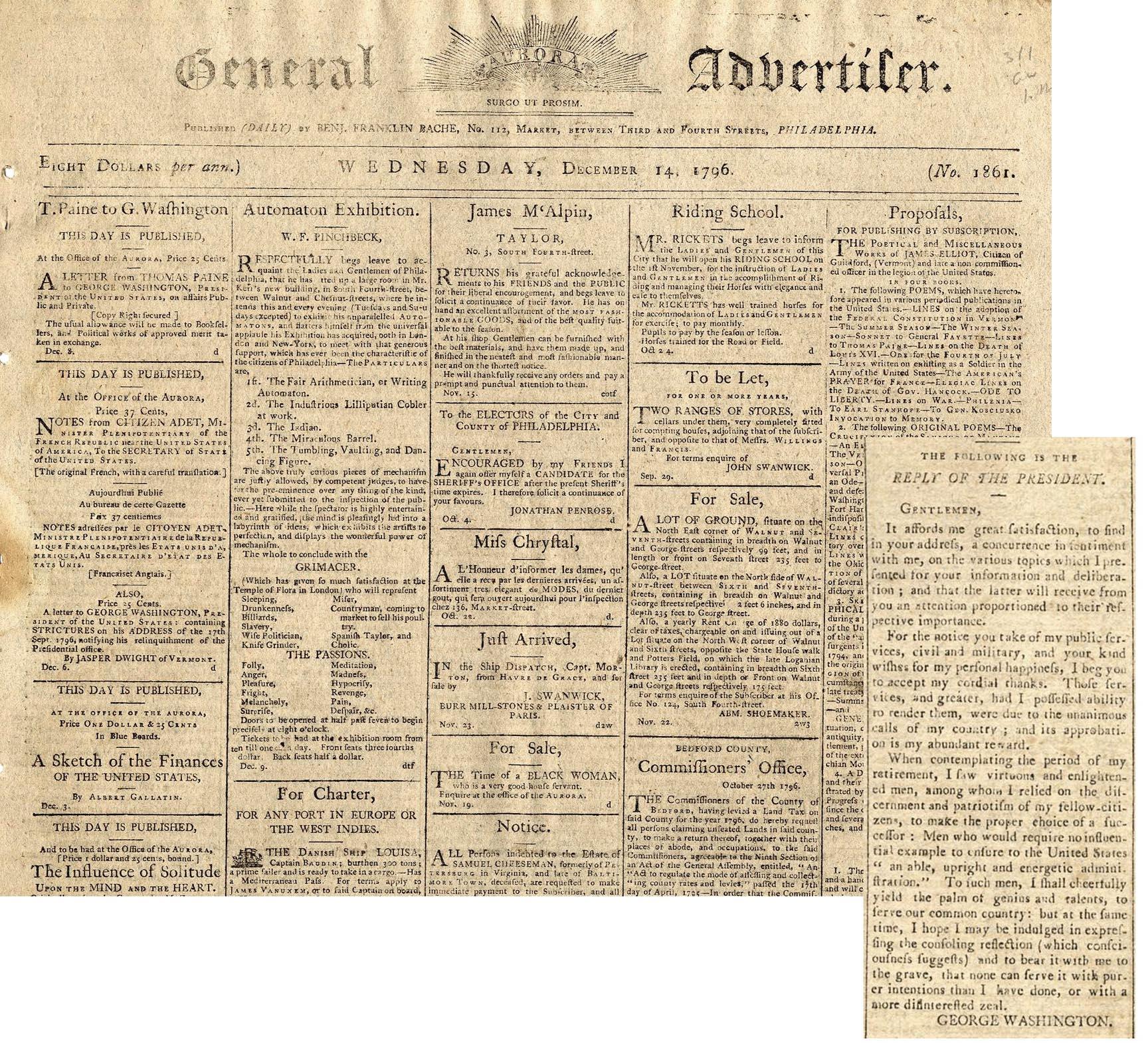 ''The Philadelphia Aurora and General Advertiser'' newspaper dated 14 December 1796. Philadelphia: Benjamin Franklin Bache: 1796. Edition includes an exchange of letters between the U.S. Senate and retiring U.S. President George Washington. The Senate wishes Washington well in his retirement, and Washington thanks the Senate and muses on his retirement from public office. Paper, measuring 13'' x 20'', runs 4pp. Mild toning, pin-size holes and chips at borders not affecting content. Very good condition.