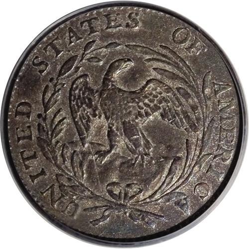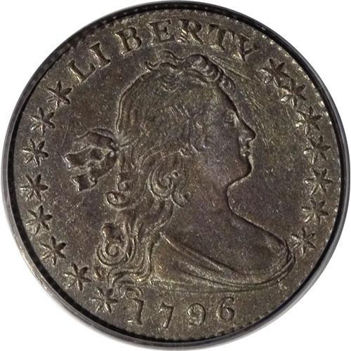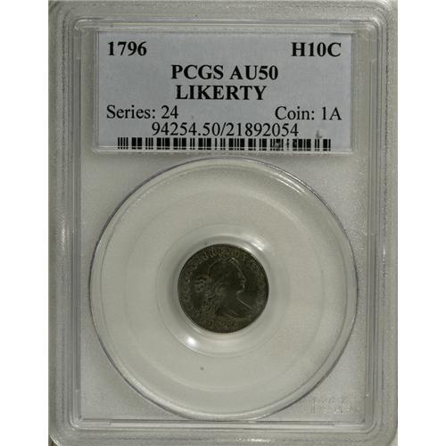 <B>1796 H10C LIKERTY AU50 PCGS.</B></I> V-1, LM-1, R.3. The weak upper and lower serifs of the B in LIBERTY create the illusion of a misspelled legend. This minimally worn charcoal-gray example has a tendency to lighten in color within the protected areas. The strike is particularly well executed in the centers, including the often-deficient breast feathers of the eagle. A cluster of short hairline scratches is noticed in the right obverse field from one of Liberty's upper curls to an area out from her chin. Any trace of remaining luster is muted by the heavy toning. Population: 1 in 50, 10 finer (12/06).<BR><BR><b>Shipping:</b> Coin/Currency (<a target="_blank" href="http://www.heritageauctions.com/common/shipping.php">view shipping information</a>)