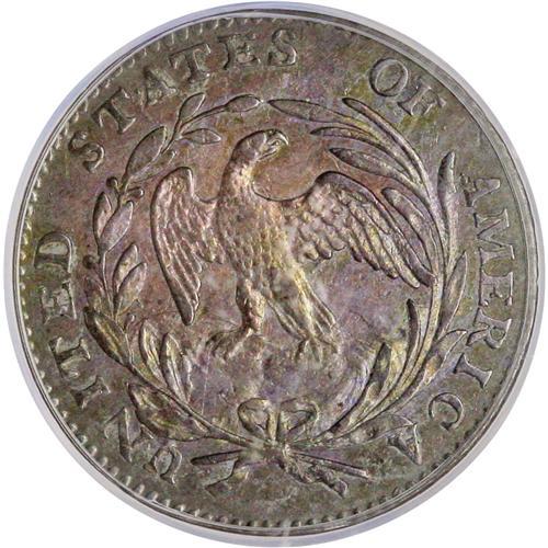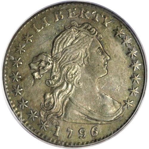 <B>1796<H10C> MS60 PCGS.</B></I> V-1, LM-1, R.3. The U.S. Mint began striking silver coins in 1794, using a Flowing Hair obverse design. In 1795, a Draped Bust design was introduced on the silver dollar. Aside from any strikes on usable backdated dies, all silver denominations from the half dime to the dollar struck the Draped Bust type exclusively in 1796. This high grade early silver type coin features deep olive toning on the obverse and blended apple-green and plum-mauve patina across the reverse. The strike is sharp despite slight bluntness on Liberty's shoulder and the eagle's breast. Prolonged examination beneath a strong lens locates a couple of unimportant marks, but none of these affect the grade or are sufficiently prominent to decide a pedigree. Population: 2 in 60, 6 finer (7/06).