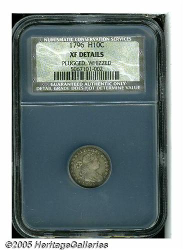 <B>1796<H10C> XF Details, Plugged, Whizzed, NCS.</B></I> V-1, LM-1, R.3. The more available of only two die pairings. The slate-gray centers are bounded by charcoal-gray borders. No plug is readily evident, however, the surfaces are grainy from whizzing.