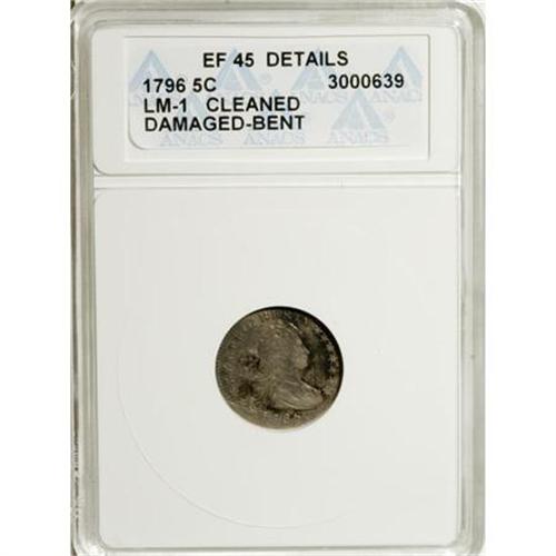 <B>1796 H10C --Cleaned, Damaged, Bent--ANACS. XF45 Details.</B></I> V-1, LM-1, R.3. Predominantly cream-gray, although glimpses of olive-brown are also present. This slightly wavy Draped Bust half dime has pleasing sharpness, although the reverse exergue is granular, and the obverse is abraded and has a couple of ice-blue stains.<BR><I>From The Laguna Niguel Collection, Part Two.</B></I><BR><BR><B>Coin Engraver:</B> Robert Scot<BR><BR><b>Shipping:</b> Coins & Currency (<a target="_blank" href="http://www.heritageauctions.com/common/shipping.php">view shipping information</a>)