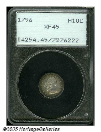 <B>1796<H10C> XF45 PCGS.</B></I> V-1, LM-1, R.3. Sea-green, golden-brown, and ruby-red colors outline the brilliant centers. A boldly detailed early silver type coin with substantial luster on the wings and curls. Some handling marks are noted near the bust truncation and in front of the profile, and a small spot beneath the right (facing) wing is accompanied by wispy pinscratches. Certified in a first generation PCGS holder.