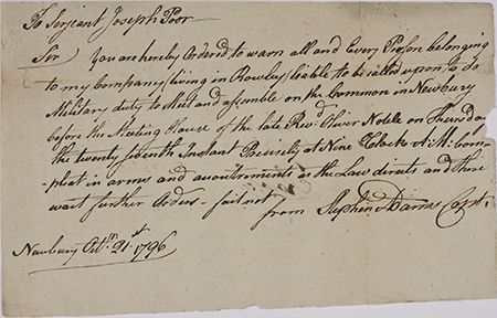 Manuscript document by a Captain, 1p. 8vo., Newbury, Oct. 21, 1796, a notice of impressment directed to Sergeant Joseph Poor, in part: "...You are hereby Ordered to warn all and Every Person belonging to my Company living in Rowley liable to be called upon to do Military duty to Meet and assemble on the Common in Newbury before the Meeting House of the late Rev. Oliver Noble opn Thursday the twenty fourth Instant...fail not...". Very good.