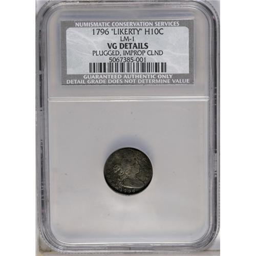 <B>1796<H10C>--Plugged, Improperly Cleaned--NCS. VG Details.</B></I> V-1, LM-1, R.3. The LIKERTY variety, but the legend has been removed by a plug near 12 o'clock and associated tooling. A whizzed slate-gray example with a bold date and well defined devices.