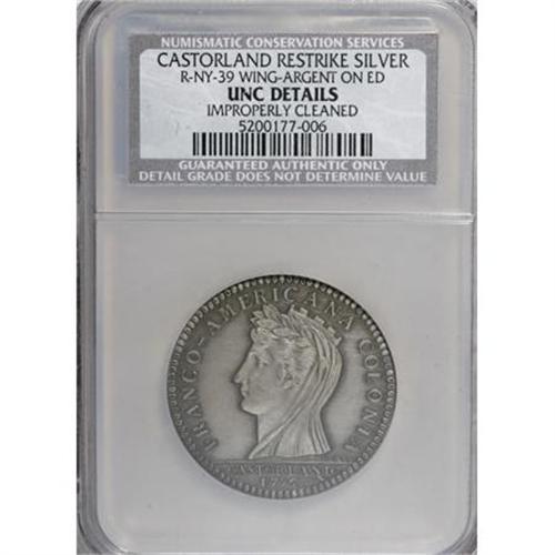 <B>1796 MEDAL Castorland Medal, Restrike Silver--Improperly Cleaned--NCS UNC Details. </B></I>R-NY-39 Wing-Argent On ED. NGC Census: (0/0). PCGS Population (0/9). (#653)<BR><BR><b>Shipping:</b> Coins & Currency (<a target="_blank" href="http://www.heritageauctions.com/common/shipping.php">view shipping information</a>)