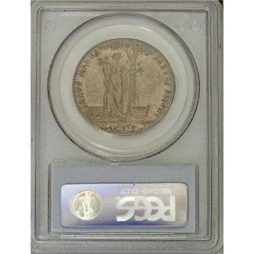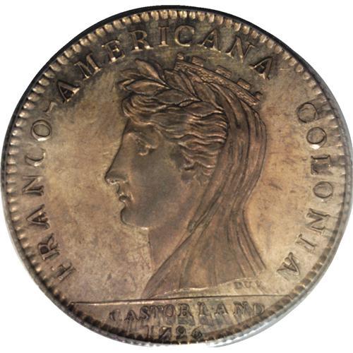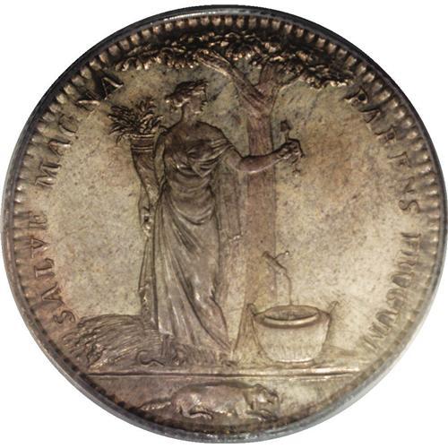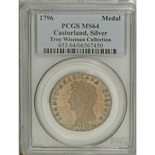 <B>1796 MEDAL Castorland Medal, Silver MS64 PCGS.</B></I> Breen-1058. Reeded Edge. Ex: Troy Wiseman Collection. The line between original and restrike Castorland medals has always been confusing. Even experts disagree, notably Walter Breen and John Ford. Ford stated in a conversation in 1997 that originals do not have die rust on the reverse, are slightly convex, and the finest he knew of was a VF35. Breen, on the other hand, on page 106 of his <I>Complete Encyclopedia</B></I> states that originals have old style lettering; on the obverse the A is below the M, 1 is embedded on a border bead. On the reverse, S is far below AL, M below AG, UG touch. Further, "all originals seen to date have traces of rust near vessel handle but no bulge at PARENS and no break at final S; restrikes from these dies show both failures in various states."<BR> This particular piece does indeed show die rust around the vessel handle; however, there is no perceptible bulging of the die in the center or around PARENS. The fields are notably reflective on each side with a few stray marks. The surfaces are toned medium gray with considerable underlying rose and lilac coloration. This is a high grade and very attractive example of a failed social experiment that resulted in the foundation of modern day Carthage, New York. Listed on pages 73 and 74 of the 2007 <I>Guide Book.</B></I><BR><I>From The Troy Wiseman Collection, Part Two.</B></I><BR><BR><b>Shipping:</b> Coin/Currency (<a target="_blank" href="http://www.heritageauctions.com/common/shipping.php">view shipping information</a>)