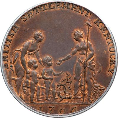 1796 Myddelton Pattern Halfpenny in Copper Breen-1074 Rarity-7. PCGS graded Proof 64 Red & Brown. Frosty chocolate and steel with 15-20% of the original mint color remaining. The surfaces are nearly flawless and offer outstanding eye appeal. No spots or stains, the only mark being a faint hairline scratch in the field below SETTLEMENT. Sharply struck and very attractive, although the fields do not have the reflectivity you expect for a proof strike. Nonetheless, these are all considered to be proofs, perhaps because they were samples made for the client rather than pieces actually struck for commerce. The client was Philip Parry Price Myddelton, an Englishman with a large tract of land in Kentucky. He ordered these halfpenny samples for a coinage he expected would be needed for the colonists he was encouraging to emigrate to his lands in Kentucky (He also had pieces struck in silver from these same dies, possibly as pattern florins. The silver version is more common than the ones struck in copper.) The devices he had placed on these samples were admittedly beautiful but they brought out the ire of the British government. The reverse was especially egregious in this regard. It depicts Britannia with her head down, her spear pointed to the ground (a symbol of defeat), and the scales of Justice and the fasces bundle on the ground where a Liberty Cap has sprung up. Hindsight suggests his coinage designs went too far and amounted to sticking his thumb into the eye of the British Government. Myddelton's ambitious project was quickly halted and he was thrown into jail. We, however, are left with Kentucky and these small, extremely rare pieces of history to help us recall Myddelton's ambitious project. Pop 2; none finer at either service.