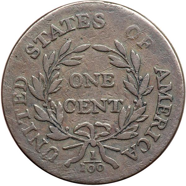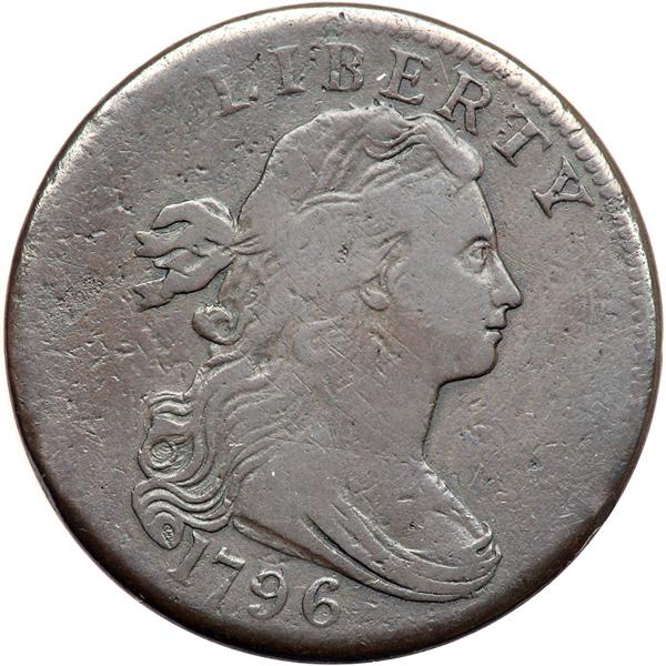 1796 NC-4 R5+ Draped Bust. VG-10. Glossy chocolate and steel. The surfaces are almost completely smooth but there are a couple small patches of microscopic roughness on the obverse. One of these is in the field left of the bottom of the hair ribbon and the other is hidden in the hair left of the neck. Only minor contact marks, including some faint hairlines on the portrait, a tiny rim nick opposite the base of the neck, a dull scratch down through the O in OF, and a scuff of hairline scratches under the left side of the fraction. All these marks blend into the attractive glossy toning and the eye appeal of this piece is nice for the grade. EDS, Breen state I, before the die crack at TES. This is the Breen plate coin for the variety. Called VG10 and tied for finest known honors in the Breen/Bland condition census. Noyes says VG10 net VG7 and tied for CC#5, his photo #28803. Removed from a PCGS slab graded F12 (old green PCGS label included).