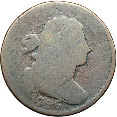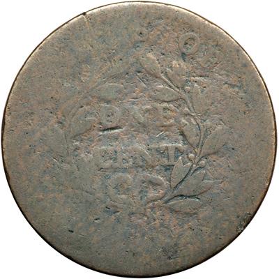 1796 NC-7 R8- Draped Bust with Stemless Wreath. PCGS graded Fair-2. Nice glossy chocolate brown. The surfaces are smooth and very nice for the grade, just heavily worn. The only notable mark is a dull nick touching the base of O in ONE. The date is full and reasonably strong considering the amount of wear, just the base of the 1 fading into the rim below. LIBERTY is mostly worn away, but RTY can be made out with some difficulty. About a third of the reverse remains legible, including ONE CENT, OF, and most of the wreath. The stemless feature is clear on the right side of the fraction, but is worn smooth on the left side. An attractive example for the grade, and the important attribution features are clear. Third finest of only 3 known. This variety features a previously unused obverse die (Breen #26) mated with the stemless reverse of 1797 S-143 & NC-8. The finest is a heavily tooled example in the ANS collection. There is a fourth impression from this pair of dies, but it hardly counts as an example of the NC-7 die variety. It is actually a half cent struck over a cut-down example of this large cent variety, and the stemless wreath feature is not present as that part of the design is off the smaller planchet. The significance of the half cent is that it validated the tooled Clapp coin in the ANS as the only known example (at that time) of a distinct variety. Dr. Sheldon listed the ANS coin in his Early American Cents published in 1949 as "NC-6". When he published Penny Whimsy in 1958 Dr. Sheldon was sufficiently skeptical of the tooled coin that he "delisted" the variety, believing it was created by tooling some other known die variety. Graded G5 net AG3 and tied for CC#2 among the 3 known examples in the Noyes census, his photo #38900. Called AG3 and tied for CC#2 in the Bland census. The amount of wear, especially on the reverse, probably doesn't justify the AG3 grade assigned by these census graders, but the superior color and surfaces make the slightly higher grade easy to accept. However, our grade is Fair-2+. PCGS Population 1; The only example graded at PCGS for the variety. DWH #1876.