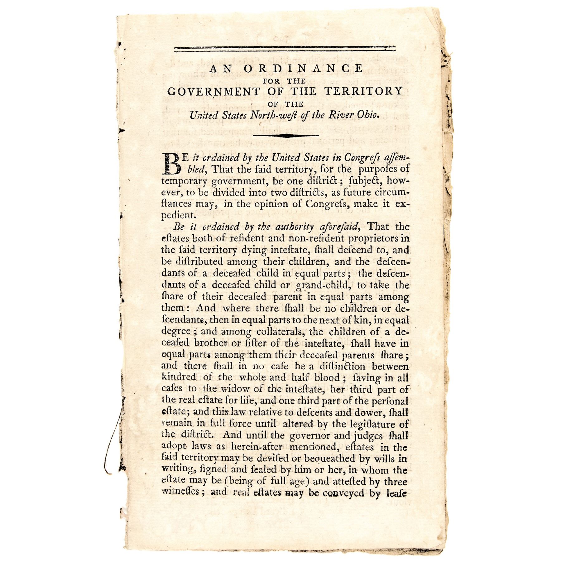 1796-Dated, Imprint Document titled, “An Ordinance For the Government of the Territory of the United States Northwest of the River Ohio,” Very Fine.