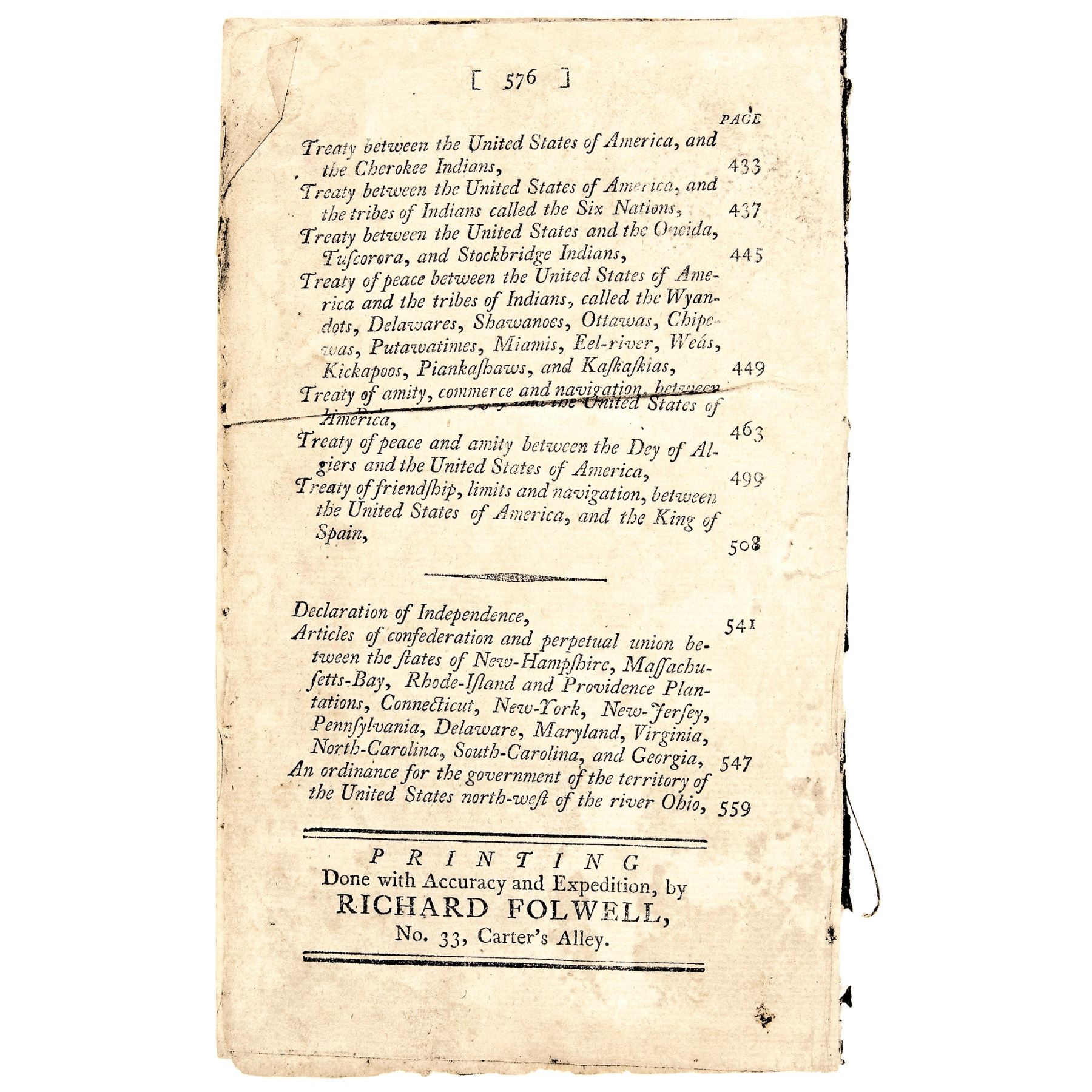 This original imprint measures 7.75” x 4.75” has 16 pages, being disbound from “The Laws of the United States of America.” Light toning and staining, not affecting legibility. It was published in 1796 by Richard Folwell of Philadelphia. The final nine pages of this document containing the Table of Contents for all three volumes of Folwell’s historic publication. That Table includes the laws passed at the First and Second Sessions of Congress, and the Treaties between the U. S. and other nations. The first seven pages hold the seven Articles of the Northwest Ordinance. Article VII forbids Slavery in the Northwest Territory.
