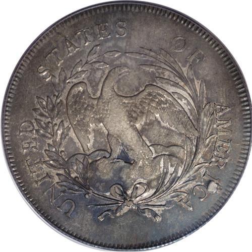 <B>1796 S$1 Large Date, Small Letters AU50 PCGS.</B></I> B-5, BB-65, R.4. A heavy die chip between the I and C of AMERICA is present to some degree on every known example of this die marriage, and it is fairly well developed on this example, joining the tops of both letters. The surfaces have mostly medium gray color with hints of gold and splashes of steel-blue on each side. Considerable luster is still visible around the devices. Possibly as many as 200 examples of the B-5 die combination survive, a population much smaller than estimated by Dave Bowers in his 1993 <I>Silver Dollar Encyclopedia.</B></I><BR><BR><b>Shipping:</b> Coins & Currency (<a target="_blank" href="http://www.heritageauctions.com/common/shipping.php">view shipping information</a>)