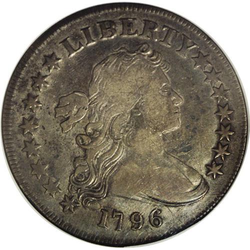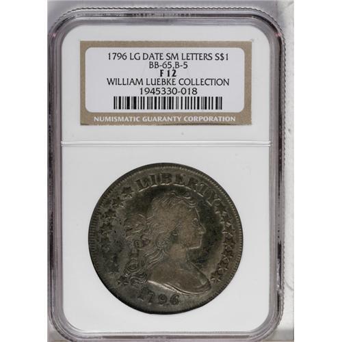 <B>1796 S$1 Large Date, Small Letters Fine 12 NGC.</B></I> B-5, BB-65, R.4. Die State II. Reiver State b. Digit 6 doubled beneath top loop; heavy die chip at right side of I in AMERICA. The usually seen die state with a rather small lump at the right top of I in AMERICA. The lump at I approaches the border but does not join the adjacent C. This is the only 1796 die variety with a Large Date obverse. Deeply toned with gray-brown and steel color. A few minor scratches are evident on each side, but fully blended with the toning. The obverse and reverse dies for this variety were not shared with any other die combinations, thus it is impossible to know exactly where this particular variety fits within the emission sequence.<BR><I>Ex: Evan Gale (2/2001).</B></I><BR><I>From The William Luebke Collection.</B></I><BR><BR><b>Shipping:</b> Coin/Currency (<a target="_blank" href="http://www.heritageauctions.com/common/shipping.php">view shipping information</a>)