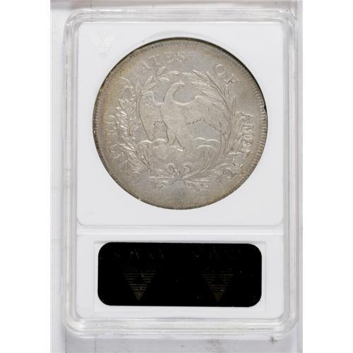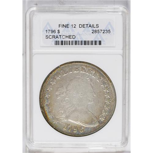 <B>1796<img border='0' src='http://www.heritagecoins.com/images/star.gif' width=10 height=10>$1> Large Date, Small Letters--Scratched--ANACS. Fine 12 Details.</B></I> B-5, BB-65, R.2. The IC die break is well advanced. Powder-blue and gold borders adorn this otherwise ivory-gray Small Eagle dollar. A few minor pinscratches on the left reverse are not distracting, although rim nicks are also seen at 8 o'clock on the obverse and 3 o'clock on the reverse.