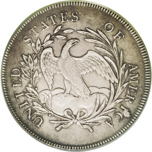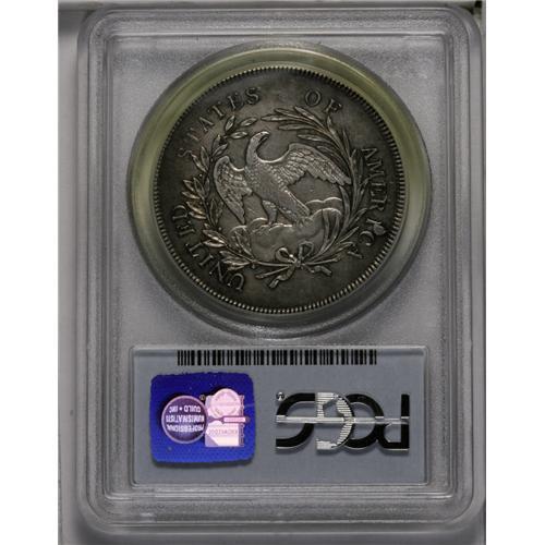 <B>1796<img border='0' src='http://www.heritagecoins.com/images/star.gif' width=10 height=10>$1> Large Date, Small Letters XF40 PCGS.</B></I> B-5, BB-65, R.2. Die State II. Dusky gray borders surround lighter centers. Moderate wear is seen on the eagle's breast and leg, but some breast feathers are present, and most of Liberty's tresses are boldly defined. The surfaces are consistently microgranular, although noticeable abrasions are absent. The familiar large die lump near the I in AMERICA does not touch the C.<BR><I>From The Long Beach Family Collection.</B></I>