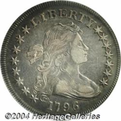 <B>1796<S$1> Large Date, Small Letters XF45 NGC.</B></I> B-5, BB-65. Die State IV. The diagnostic reverse die break (as struck) at the IC in AMERICA is well advanced and it prominently joins both letters. This is the second most plentiful die marriage of the 1796 Draped Bust Dollar in today's hobby, and survivors are often used for type purposes. This richly and original toned example displays dominant lavender-gray color with some near-brilliance noted over a few of the raised features on the reverse. True, both sides are abraded from time spent in circulation, but neither displays any distraction that are worthy of individual mention. Well centered on the planchet, the impression was undoubtedly bold because there is plenty of remaining definition over all features. <BR><BR><B>Important notice:</B> Heritage usually auctions material at the rate of 200-250 lots per hour. On some occasions eBay Live bid software or the Internet may not be able to keep up with the pace of the auction. We recommend placing a realistic absentee bid now as insurance to avoid disappointment. Occasionally the auctioneer may eliminate or reject an eBay Live bid, and the auctioneer may also reopen a lot after the close of the eBay live bidding (usually because we missed an audience bid), and may reject your bid even if it shows you as the winning bidder. By bidding via eBay Live, you agree that Heritage may award the lot to another bidder at its sole discretion under the circumstances described above or any other reasonable circumstances. Since eBay bids are not shown to us until we open the lot on the floor, we treat those bids just like floor bids. In most cases the floor responds before the eBay bid is presented to us, due to Internet lag time, so for consistency we have made it a policy that floor bids are always considered first over tie eBay live bids. Also please note that all Heritage lots purchased through eBay Live carry a 20% Buyer's Premium. Please make sure you read the Terms and Conditions before you bid. </span></font></tr></table></td></tr></table>