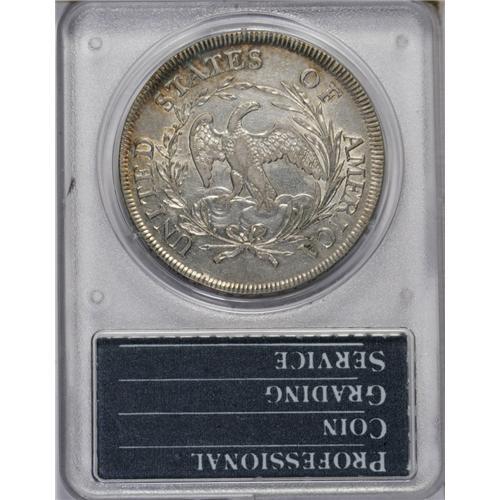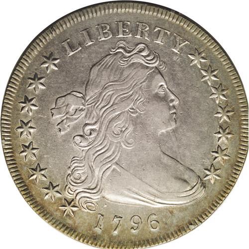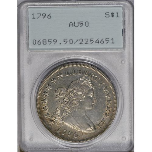 <B>1796<img border='0' src='http://www.heritagecoins.com/images/star.gif' width=10 height=10>$1> Small Date, Large Letters AU50 PCGS.</B></I> B-4, BB-61, R.2. Die State I per the Bowers-Borckardt reference. The top curl is intact without any evidence of die lapping. Most examples of the B-4 variety are in this early die state. Similar die state to lot 23487 in the Reiver sale. Although this is the most common variety of the year, as evidenced by three examples in the present sale, it is seldom encountered in the finer grades. A few splendid Mint State examples are known, followed by these three coins and a small number of other really attractive AU pieces. The typical survivor is apt to grade VF or so. This is a lovely AU grade coin with light silver-gray color accented by pale champagne and light gold toning. The surfaces retain considerable luster, especially on the reverse.<BR><I>From The Royal Oak Collection.</B></I>