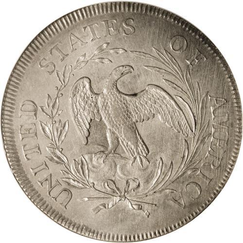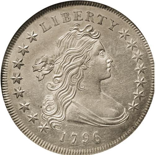 <B>1796 S$1 Small Date, Large Letters AU58 NGC.</B></I> B-4, BB-61, R.3. A lightly toned honey-gold and powder-blue example with extensive luster and smooth, clean surfaces. The right reverse border exhibits minor adjustment marks, and slight rub is noted on the eagle's leg and belly, and on Liberty's cheek and drapery. The NGC Census is a little confused for this variety, since only in recent years have varieties been designated on NGC holders. NGC has certified two B-4 dollars as AU58 with one finer, and eight 1796 dollars of unknown variety (several among these are presumably B-5) with four finer. The only 1796 dollar graded finer than MS62 by NGC is a solitary MS63 B-5 (10/06). Meanwhile, PCGS has certified two Small Date, Large Letters pieces, with none finer. Although the exact place of the present piece within the Condition Census is unknown, it clearly ranks among the finest 1796 Small Date, Large Letters dollars, and is worthy of the finest specialized holding. Census: 13 in 58, 7 finer (10/06).<BR><BR><b>Shipping:</b> Coin/Currency (<a target="_blank" href="http://www.heritageauctions.com/common/shipping.php">view shipping information</a>)