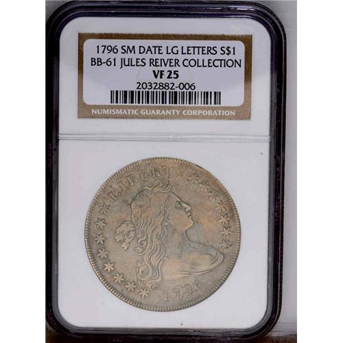 <B>1796<S$1> Small Date, Large Letters. B-4, BB-61, R.2. VF25 NGC.</B></I> Small, wide date, 96 close, die dot above 1; Berry under first T in STATES. Reiver die state c. Bowers-Borckardt die state II. Medium silver in color and attractive for the grade. The strike is typical, with no weakness aside from a few of the upper right obverse stars. Identifiable by a minor scratch which connects the lower portion of the 96, and another mark which cuts across the lower and outer points of the final star.<BR> On this particular coin, the lump over the 1 in the date is very weak. This may have been partially caused by wear or die lapping. However, we note that the curl between the date and the first star is rather sharp, as is the curl atop Liberty's head while her forehead curl is expectedly lapped and disconnected from her head as usually seen on this variety. Several coins are known which show these curls with more die lapping, and this is apparently not the latest die state of this variety.<BR><I>Ex: Superior's H. Rolland Willasch Sale (May, 1990), lot 462.</B></I> Envelope Included.