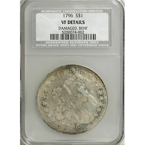 <B>1796 S$1 Small Date, Large Letters--Damaged, Bent--NCS. VF Details.</B></I> B-4, BB-61, R.3. There are bulges on the profile, the E in LIBERTY, and the eagle's right (facing) wing. Other areas are only slightly wavy. Granular near Liberty's hair ribbon, and the field near the TED in UNITED is tooled with thin marks. The portrait has minor adjustment marks, and both sides have a few scratches.<BR><BR><b>Shipping:</b> Coins & Currency (<a target="_blank" href="http://www.heritageauctions.com/common/shipping.php">view shipping information</a>)