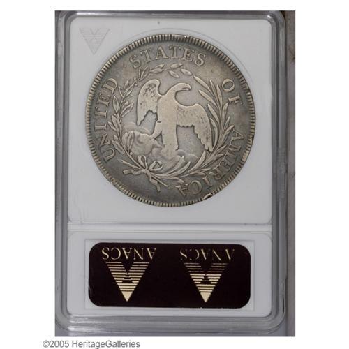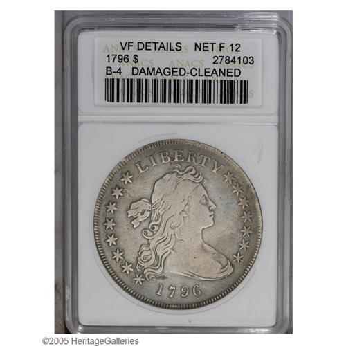 <B>1796<S$1> Small Date, Large Letters--Damaged, Cleaned--ANACS. VF Details, Net Fine 12.</B></I> B-4, BB-61, R.3. Minor reverse edge marks at 3, 4, 7, and 11 o'clock do not especially distract, and some wispy hairlines across the devices is not unexpected for the grade. Some hair and plumage details remain present. A collectible pearl-gray and steel-blue early dollar.<BR><I>From The Ross Bailey Collection.</B></I>