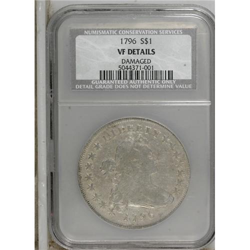 <B>1796 S$1 Small Date, Large Letters--Damaged--NCS. VF Details.</B></I> B-4, BB-61, R.3. A moderately worn example of this scarce variety, one differentiated by the close TE of STATES and the presence of one leaf below the D of UNITED. The pearl-gray obverse displays several cuts on the portrait and other muted abrasions.<BR><BR><b>Shipping:</b> Coins & Currency (<a target="_blank" href="http://www.heritageauctions.com/common/shipping.php">view shipping information</a>)