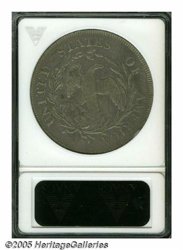 <B>1796<S$1> Small Date, Large Letters VF25 ANACS.</B></I> B-4a, BB-61. This variety is most easily attributable by the die dot over the 1 in the date, and a berry under the first T in STATES. Evenly worn over the highpoints with medium gray and blue toning over most of the surfaces and lighter reddish-golden accents scattered about. A small bump is detected at 4 o'clock on the reverse rim.