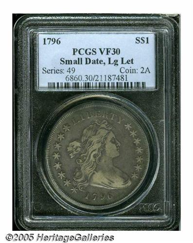 <B>1796<S$1> Small Date, Large Letters VF30 PCGS.</B></I> B-4, BB-61, R.2. Easily distinguished by the die dot over the 1 in the date. The most common die marriage of the year, the present example, therefore, is a desirable Choice VF representative of the 1796 Draped Bust Dollar. This coin is mostly slate-gray in appearance, although we note lighter silver-gray accents on the highpoints on each side. Free of mentionable handling marks, both sides are uncommonly abrasion-free for an early Silver Dollar that saw this extensive circulation. Moderate wear is evenly distributed throughout.