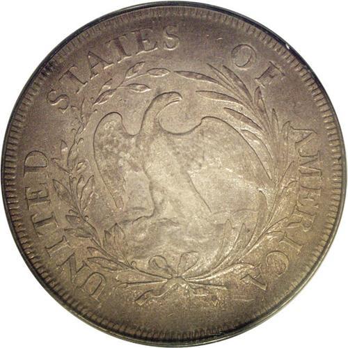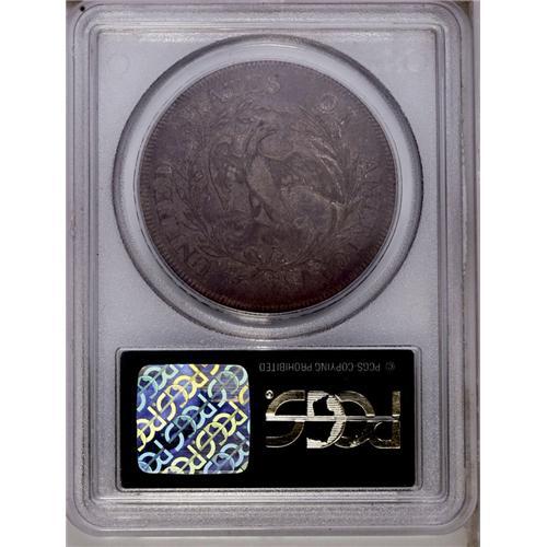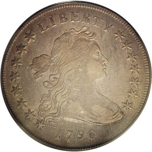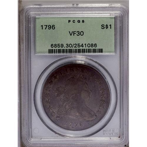 <B>1796<img border='0' src='http://www.heritagecoins.com/images/star.gif' width=10 height=10>$1> Small Date, Large Letters VF30 PCGS.</B></I> B-4, BB-61, R.3. The variety is attributed by a small, wide date, the 96 close, a die dot above 1, and a berry under first T in STATES. This VF specimen displays even medium gray toning and sharply defined design features. Most of Liberty's hair detail shows, except for that in the top of the head, and about one-fourth of the eagle's feathers are visible. The dentilation is strong, especially on the reverse, and the design elements are nicely centered on the planchet. A few minute marks are visible under magnification, particularly on Liberty's face and chest and in the right (facing) obverse field; these do not stand out, however, due to concealment by the toning. Overall, a nice early dollar that will fit comfortably into a mid-grade collection.