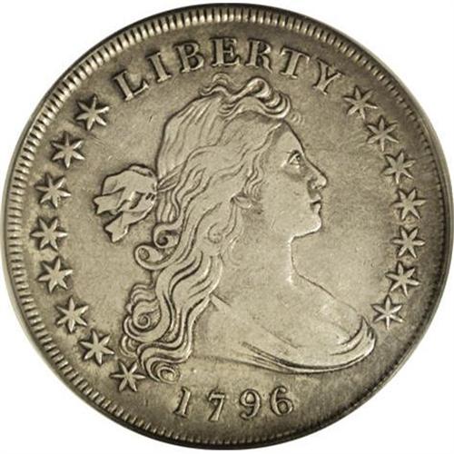 <B>1796 S$1 Small Date, Large Letters VF35 PCGS.</B></I> B-4, BB-61, R.3. Die State I. Reiver State a. Serif of 1 far from curl; leaf tip joins left inside base of final A. The upper obverse details are mostly complete, the usual die state for this variety. Later die states have the top hair curls, especially at the forehead, weakened from die lapping. The forehead curl consists of three arcs attached at the top, but isolated in the field. Lovely gray-gold surfaces with a few minor scrapes on each side, not unusual for the grade, and not readily apparent. This variety is easily the most common of the year and is an excellent choice for date or type collectors. Several AU and Mint State examples are known, but like most early dollars, VF and XF are the most regularly seen grades. Despite its status as the most common silver dollar of the date, examples are not easily located. There are six different die varieties known for the 1796 silver dollars, and the current estimated combined population is less than 1,500 coins in all grades, despite higher published figures. Not more than 500 examples of this B-4 die marriage survive.<BR><I>Ex: Old Roman (eBay, 9/1999).</B></I><BR><I>From The William Luebke Collection.</B></I><BR><BR><b>Shipping:</b> Coin/Currency (<a target="_blank" href="http://www.heritageauctions.com/common/shipping.php">view shipping information</a>)