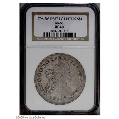 <B>1796<S$1> Small Date, Large Letters XF40 NGC.</B></I> B-4, BB-61, R.2. Distinguished by the die dot directly above the 1 in the date. Medium gray color is accented with pale olive and rose as the coin turns under a light. An exceptionally smooth, well centered example.