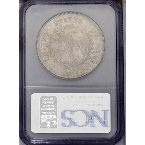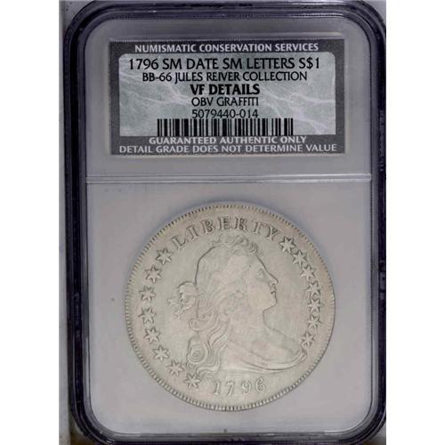 <B>1796<S$1> Small Date, Small Letters. B-1, BB-66, R.4--Obverse Graffiti--NCS. VF Details.</B></I> Small, wide date, 96 close, no die dot over 1; Berry under A in STATES. Reiver state a. Bowers-Borckardt state II. This is the Reiver plate coin for the obverse and reverse of this variety. The obverse graffiti is located on Liberty's neck, chest and the field above, but is quite faint and a loupe is needed to see this transgression. The first letter is either a script "E" or an upside down 3, and the next letter is not readily discernible. The coin is a bit washed out and a dull silver color throughout. No adjustment marks or rim bumps are seen.<BR> Once again, this is a fairly scarce coin, a bit more difficult to locate than the B-2, BB-63 variety, but apparently enough are available to satisfy variety collector demand as little premium is secure and example over a much more common type coin of this date. It is worth noting that two advanced specialists in this series, both found the present coin perfectly acceptable to represent this variety.<BR><I>Ex: Stack's Spies Sale (December, 1974) lot 22.</B></I> Envelope Included.