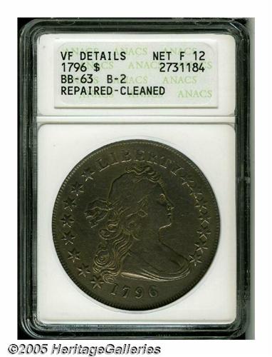 <B>1796<S$1> Small Date, Small Letters--Repaired, Cleaned--ANACS. VF Details, Net Fine 12.</B></I> B-2, BB-63, R.4. Medium argent-gray color tends to mask the underlying handiwork. Smooth and well centered.