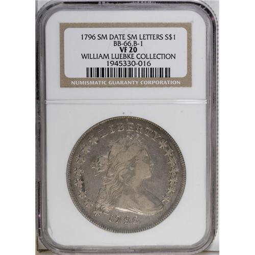 <B>1796 S$1 Small Date, Small Letters VF20 NGC.</B></I> B-1, BB-66, R.4. Die State II. Close date, 9 and 6 both lean slightly right; paired berries below left side of first S. The reverse die has been lapped in this die state. This reverse die was used for all four years of the Draped Bust, Small Eagle design type, with a total of six different obverse dies including three of 1796. The same state of the reverse die, with evidence of lapping or resurfacing, appears on the 1797- and 1798-dated coins, suggesting that this 1796 B-1 die variety may have been struck in either of those later years. It is possible that this is really a "1798" silver dollar. Attractive pewter-gray surfaces with peripheral golden-brown toning. Lighter silver color highlights the devices on each side. Smooth and desirable surfaces with no significant defects.<BR><I>Ex: Jim McGuigan (4/2002).</B></I><BR><I>From The William Luebke Collection.</B></I><BR><BR><b>Shipping:</b> Coin/Currency (<a target="_blank" href="http://www.heritageauctions.com/common/shipping.php">view shipping information</a>)