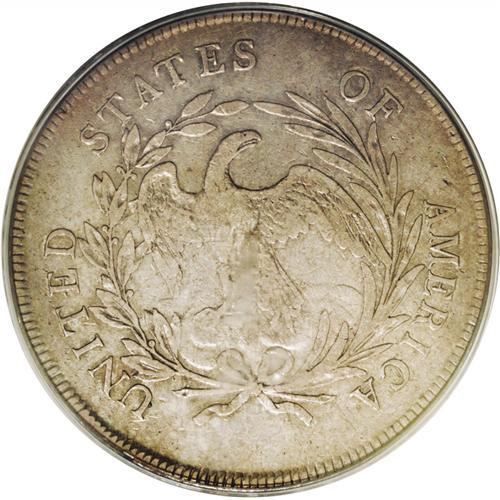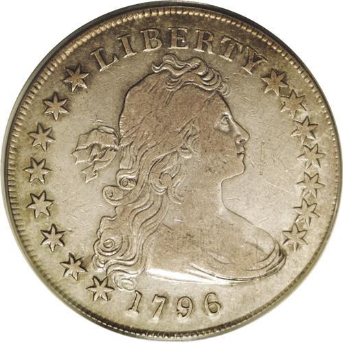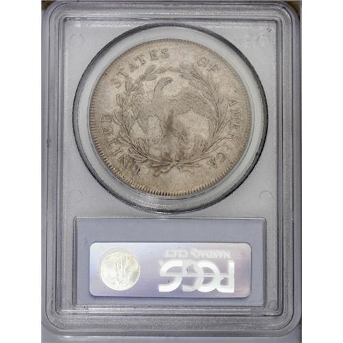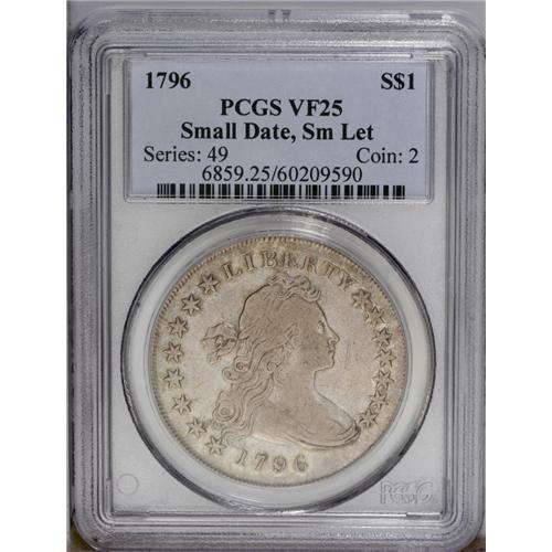 <B>1796<img border='0' src='http://www.heritagecoins.com/images/star.gif' width=10 height=10>$1> Small Date, Small Letters VF25 PCGS.</B></I> B-2, BB-63, R.4. Attractive grayish-brown toning with hints of lilac color cover the surfaces on both sides of this pleasing Small Eagle dollar. The surfaces have only minor abrasions, consistent with the grade. The only significant mark is a vertical scrape in the right obverse field. <BR><BR><B>Important notice:</B> Heritage usually auctions material at the rate of 200-250 lots per hour. On some occasions eBay Live bid software or the Internet may not be able to keep up with the pace of the auction. We recommend placing a realistic absentee bid now as insurance to avoid disappointment. Occasionally the auctioneer may eliminate or reject an eBay Live bid, and the auctioneer may also reopen a lot after the close of the eBay live bidding (usually because we missed an audience bid), and may reject your bid even if it shows you as the winning bidder. By bidding via eBay Live, you agree that Heritage may award the lot to another bidder at its sole discretion under the circumstances described above or any other reasonable circumstances. Since eBay bids are not shown to us until we open the lot on the floor, we treat those bids just like floor bids. In most cases the floor responds before the eBay bid is presented to us, due to Internet lag time, so for consistency we have made it a policy that floor bids are always considered first over tie eBay live bids. Also please note that all Heritage lots purchased through eBay Live carry a 20% Buyer's Premium. Please make sure you read the Terms and Conditions before you bid. This lot is being auctioned in conjunction with a live floor auction by Heritage Galleries & Auctioneers. All final auction and invoice information will be supplied by Heritage Galleries & Auctioneers, and all other information should be considered preliminary. Lot:2115 <BR><BR><B>Winning Notification and Billing:</B> After the FINAL session in this auction is complete, Heritage will send e-mail and snail mail invoices. This process normally takes several days. All final auction and invoice information will be supplied by Heritage Galleries & Auctioneers, and all other information should be considered preliminary. <BR><BR>This auction will be conducted on a live auction floor and over the Internet through eBay Live. If you choose to place an absentee bid, please take a moment to <font color='#0000ff'><u><a href='http://pages.ebay.com/liveauctions/help/before/laabsentee.html'>learn how eBay Live absentee bidding works</a></u></font><font color='#000000'>