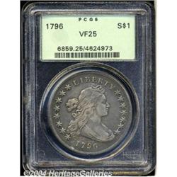 <B>1796<S$1> Small Date, Small Letters VF25 PCGS.</B></I> B-4, BB-61, R.2. This is a splendid example of the variety with light to moderate wear and very pleasing surfaces. Medium grayish-gold with lighter devices and very few minor imperfections. The Small Eagle silver dollars, produced from 1795 through 1798, are becoming increasingly hard to locate in the numismatic marketplace. We believe this is due to a large number of die variety collectors that have recently entered the early dollar arena and purchased numerous examples. <BR><BR><B>Important notice:</B> Heritage usually auctions material at the rate of 200-250 lots per hour. On some occasions eBay Live bid software or the Internet may not be able to keep up with the pace of the auction. We recommend placing a realistic absentee bid now as insurance to avoid disappointment. Occasionally the auctioneer may eliminate or reject an eBay Live bid, and the auctioneer may also reopen a lot after the close of the eBay live bidding (usually because we missed an audience bid), and may reject your bid even if it shows you as the winning bidder. By bidding via eBay Live, you agree that Heritage may award the lot to another bidder at its sole discretion under the circumstances described above or any other reasonable circumstances. Since eBay bids are not shown to us until we open the lot on the floor, we treat those bids just like floor bids. In most cases the floor responds before the eBay bid is presented to us, due to Internet lag time, so for consistency we have made it a policy that floor bids are always considered first over tie eBay live bids. Also please note that all Heritage lots purchased through eBay Live carry a 20% Buyer's Premium. Please make sure you read the Terms and Conditions before you bid. </span></font></tr></table></td></tr></table>