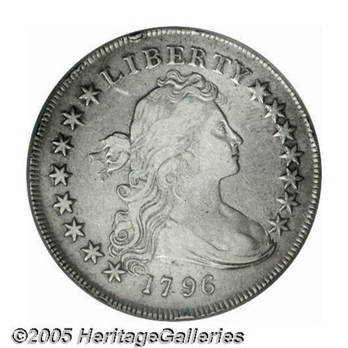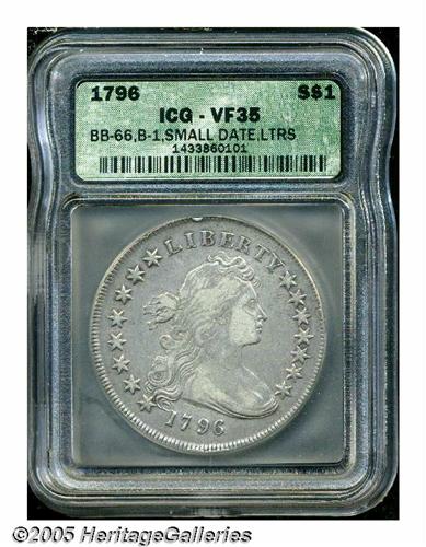 <B>1796<S$1> Small Date, Small Letters VF35 ICG.</B></I> B-1, BB-66, High R.3. A scarcer die pairing that can be identified by the comparatively close spacing of the 96 in the Small Date. Both sides have a relatively light silver-gray appearance with some deeper charcoal accents that are more noticeable on the obverse. A small rim bump is noted within the holder between 11 and 12 o'clock on the obverse.