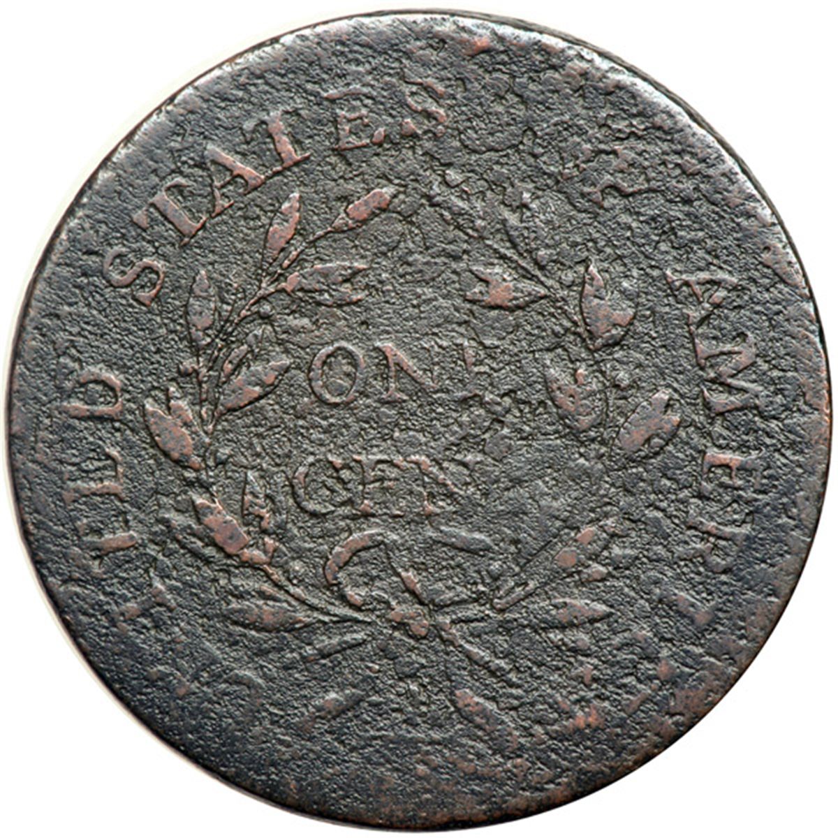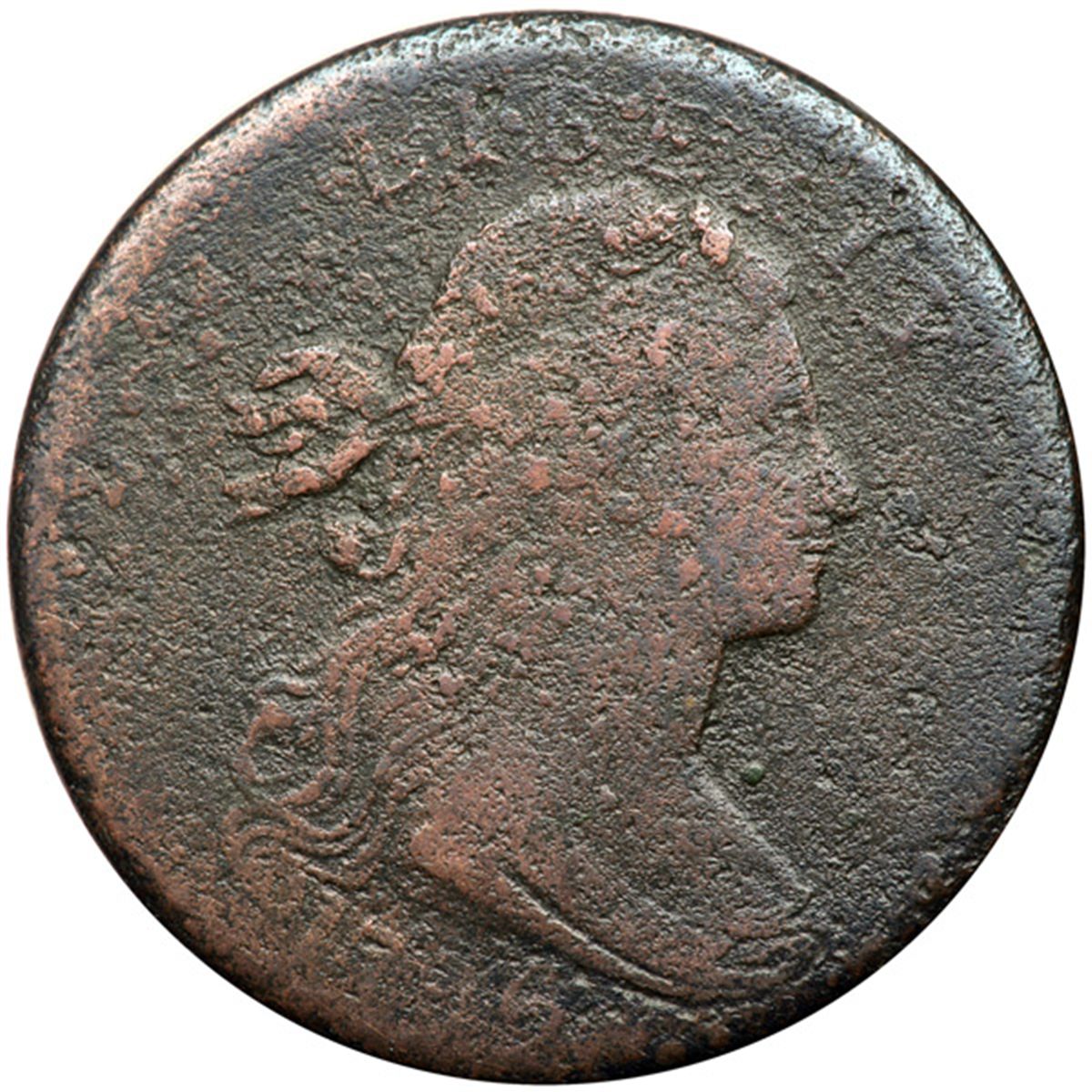 1796 S-100 R5 Draped Bust AG3. Sharpness VG7 but covered with moderate roughness, strongest on the reverse. No marks or verdigris. Dark chocolate and olive brown with lighter steel brown highpoints. The date is weak but readable and the legends are nearly complete. EDS, Breen state I.