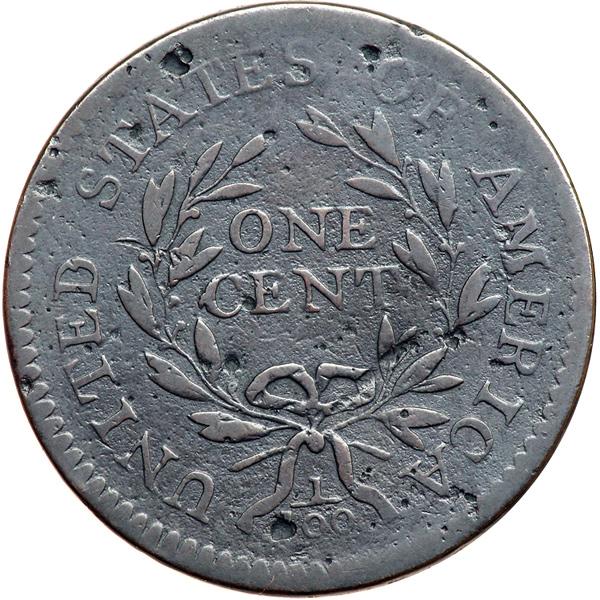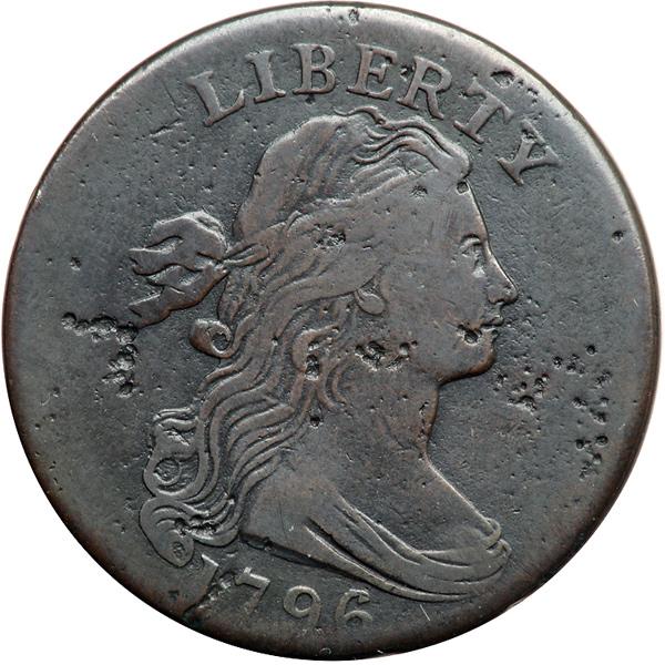 1796 S-102 R4 Draped Bust. VG-8. Sharpness F12 but there are a dozen or so pitmarks scattered over both sides plus a shallow dent on the leaves under T in CENT. The remainder of the planchet is smooth and there is no verdigris. Glossy dark olive and steel with chocolate toning on the highpoints. The date and legends are clear. EDS, Breen state I, before any die cracks on the obverse. Clear doubling shows on the chin and jaw from die bounce (Breen mentions this occasional doubling on page 326 of his large cent encyclopedia).
