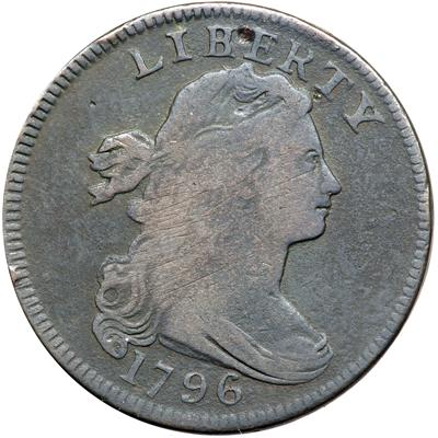 1796 S-104 LIHERTY Obverse R3. VG-7. Draped Bust. Sharper by several points but dull from extremely fine granularity that covers the fields and protected areas. No verdigris, but there are several faint hairline scratches on the portrait and a dull punchmark nestled under the upper left seriph of the E in LIBERTY. Dark olive and steel. M-LDS, Breen state III early. The die cracks on the reverse are present but the die rust found on some examples of this die state has not formed. The date and legends are strong and the LIHERTY error is bold.