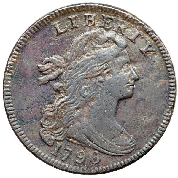 1796 S-104 R3 Draped Bust with LIHERTY Obverse VG10. Sharpness VF35 but parts of the planchet show shallow erosion, strongest at ERT above the head. Extremely fine roughness also covers much of both sides, but overall the eye appeal is not too bad in spite of the obvious imperfections. There are faint traces of greenish verdigris on both sides and on the edge, but the verdigris is visible only with the aid of a glass. Rather glossy mix of light and dark chocolate tones blended with some reddish chocolate and olive. MDS. The LIHERTY error (B over inverted B forming an "H") is clear. The date and legends are strong. An acceptable example of this popular "Redbook" variety.