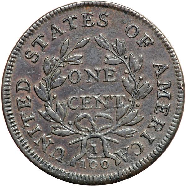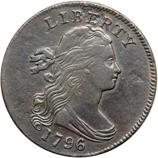 1796 S-105 R5- Draped Bust. Fine-15. Boldly Repunched 6. Sharpness EF40 but burnished to remove patches of shallow corrosion, especially at the E in LIBERTY and in the field before the tip of the nose. A small, dull dig under the N in UNITED is a good identifying mark for this sharply detailed cent. Recolored an attractive glossy chocolate brown with traces of frosty lighter brown toning in some of the protected areas. Decent eye appeal in spite of the obvious burnishing. E-MDS, Breen state II, showing some die clashmarks but no cracks. The repunching on the 6 is sharp. Great detail for this tough die variety with only a single example known that has more detail than the piece offered here.