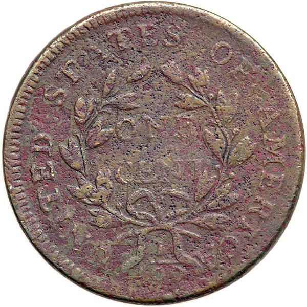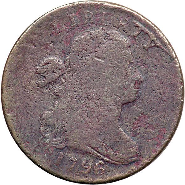 1796 S-105 R5- Draped Bust. Good-4. Boldly Repunched 6. Several points sharper but covered with microscopic porosity. No verdigris, and the only contact mark is a dull horizontal nick in the center of the head even with the eyebrow. Slightly glossy reddish steel and chocolate. The date and legends are complete and easily readable. Extremely rare LDS (but not quite the latest), Breen state IV early. A very strong die crack connects the tops of TY to the rim and this crack outlines a slightly raised retained cud over those letters. Breen did not list this intermediate state in his encyclopedia, and your cataloger is not aware of another example. Only a single example with the full cud break is listed in the Noyes census. A very important cent to the die state specialist.