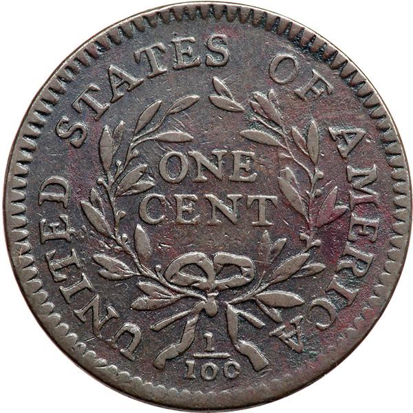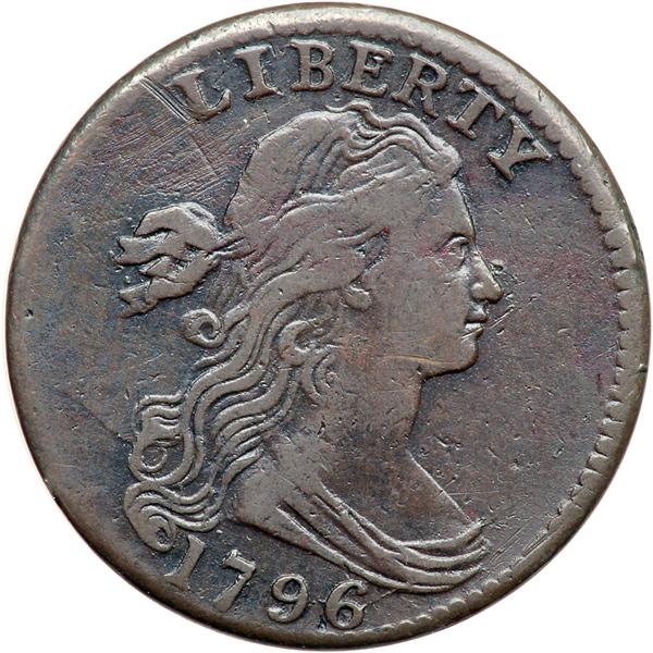 1796 S-108 R4 Draped Bust. Fine-12. Sharpness VF25 but the field behind the portrait is covered with fine pinscratches. These scratches blend into the glossy patina on an otherwise very attractive cent. The only other notable marks are a shallow scrape along the left edge of the L in LIBERTY and a thin horizontal contact mark on the jaw above the throat. Glossy chocolate brown with darker chocolate toning in protected areas and reddish chocolate toning blended onto both sides. LDS, Breen state V, with a clear die crack from the lower curls into the field at left.