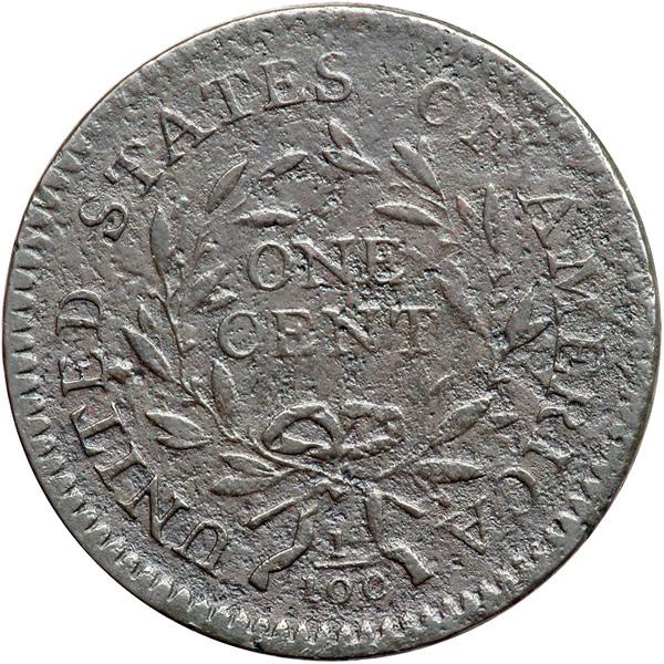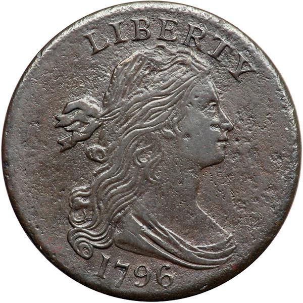 1796 S-109 R3 Draped Bust. Fine-12. Sharpness VF35 but lightly corroded, then burnished to minimize the roughness. No verdigris, and the only contact mark is a dull, barely visible scrape from the bottom of the R into the hair below. Retoned a very attractive and natural-looking glossy chocolate brown. M-LDS, Breen state IV, with a die crack from the dentils through T in LIBERTY into the hair below. The date is bold and the legends are clear.